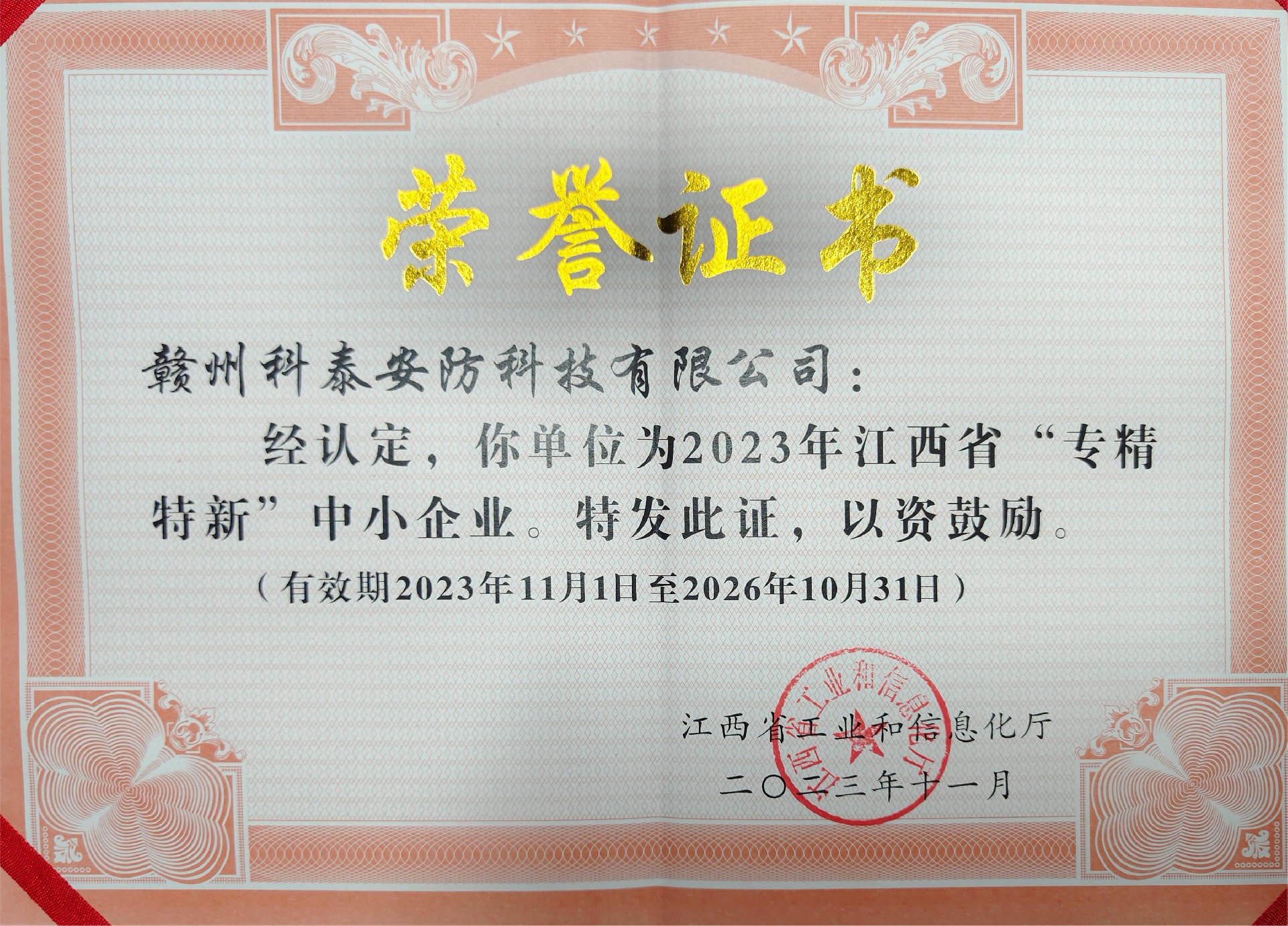 2023年11月1日,贛州科泰安防科技有限公司喜獲“專精特新”中小企業(yè)榮譽(yù)證書。