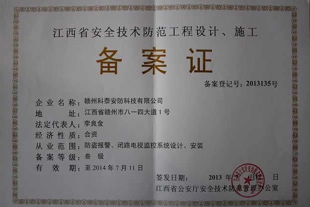 熱列慶祝贛州科泰安防科技已成功取得了由江西省公安廳安全防范辦公室頒發(fā)的三級(jí)安防設(shè)計(jì)、施工證書(shū)。
